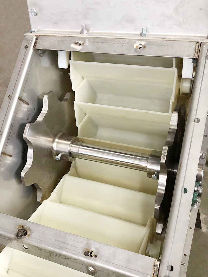 (1)驅(qū)動功率小,采用流入式喂料、誘導式卸料、大容量的料斗密集型布置,在物料提升時幾乎無回料和挖料現(xiàn)象,因此無效功率少。